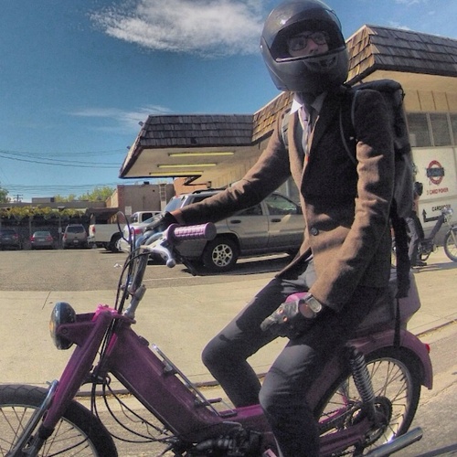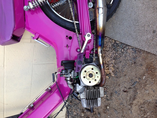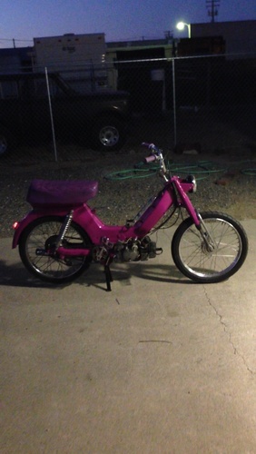 KTM Foxi with a Puch e50. This is my girl's bike, she wanted it powdered purple (came out pinkish though)...lil gas guzzlin' blaster. Tank rack and custom quilted seat are my fav parts.