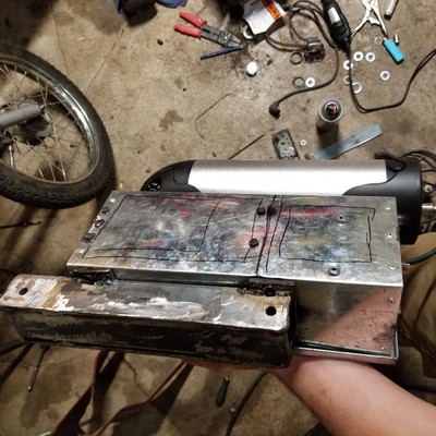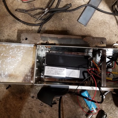Had to do a ton of work making the forks work, swapping shocks, making seat mounts for another seat, replacing rusted out hardware, wiring in new lights, wiring up the electric, making a bolt in mount for the controllers and battery, adapting the electric wheel to fit, cleaning up the existing wheel to work and brake again, still needs longer kickstand. But it works!