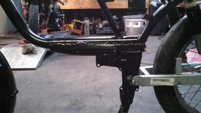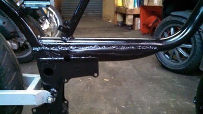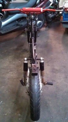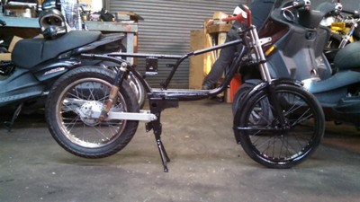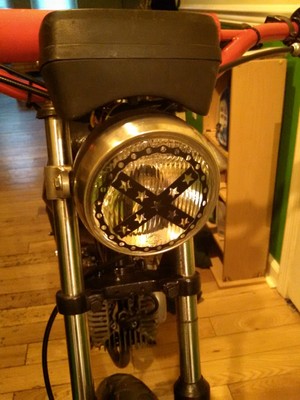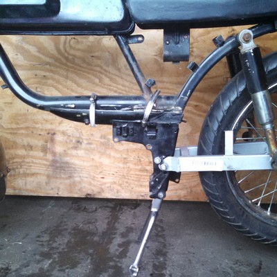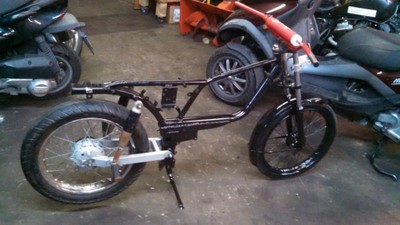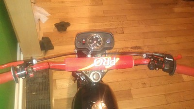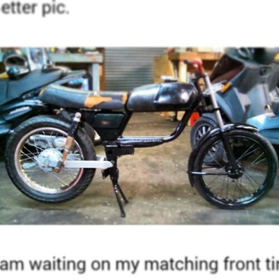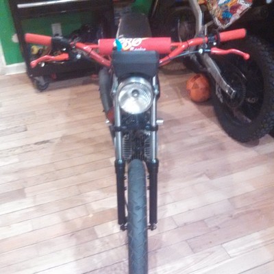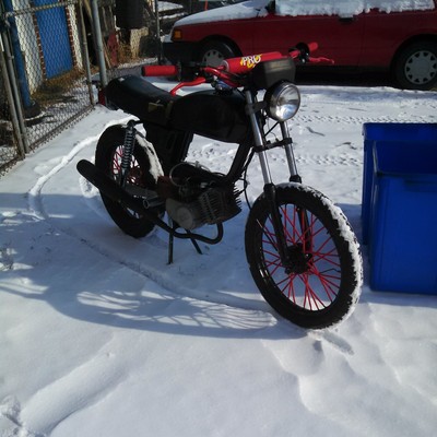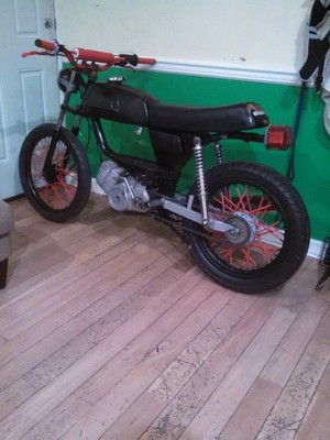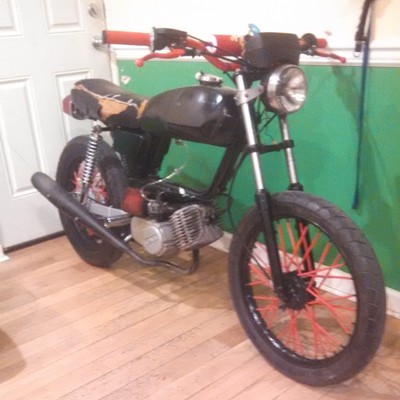 Electric start Half General 5-Star , Half Tomos Streetmate. Ripped a V1 & its mounts off the General & threw the bottom half of a Tomos streetmate frame & swingarm on it, welded it & bam! All new parts all over, cables, wires, brakes, stuffed crank, speedo, tires, LEDs, etc. If you can think it I put a new one on. Going to powder coating soon.