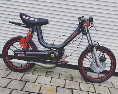 Update 14.08.2017: The old setup is gone, I now have a 100cc Simonini Engine with a new exhaust, all mounted to a custom frame. The rear shocks are from paioli, they are a bit shorter as the marzocchis were a bit too big for the moped :)