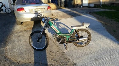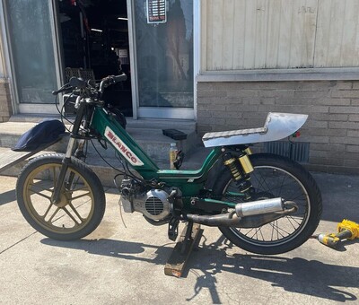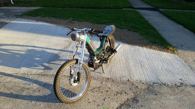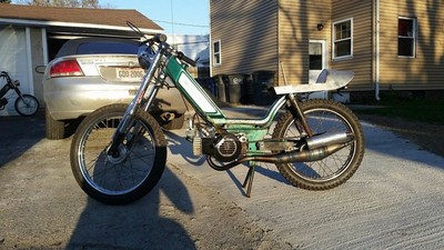 Green Blanco frame with Puch Magnum length inverted EBR's, MLM seat pan, I'm short and fit nicely on this bike. I had the exhaust studs filled in and re-tapped out to Puch size, making for a much larger exhaust port. Another fun V1 on the roads of Ohio and Michigan