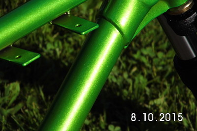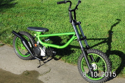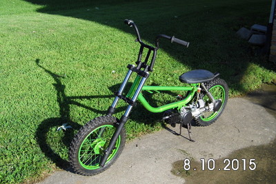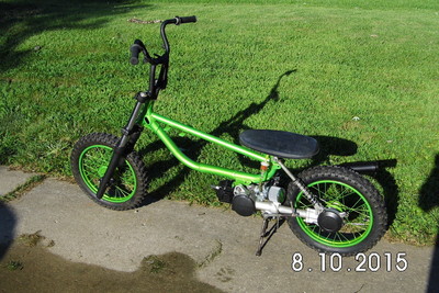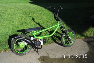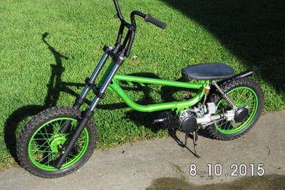 Stock Front wheel modded for Disc brake. Powder coated Granny Smith Green with new 2.5"x14" Knoby Tire.