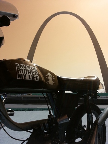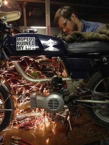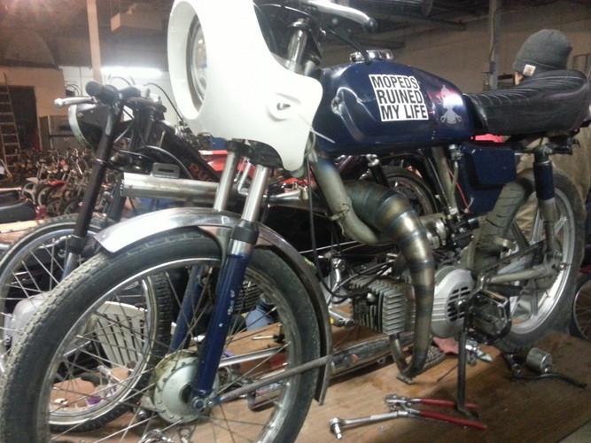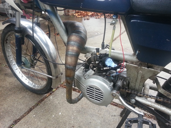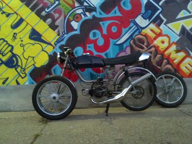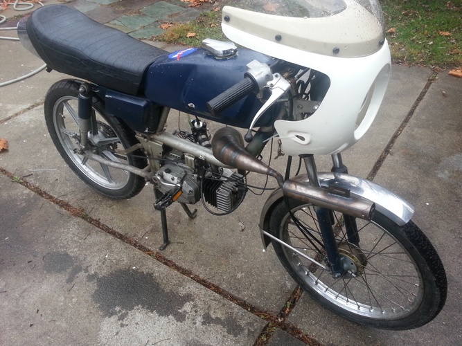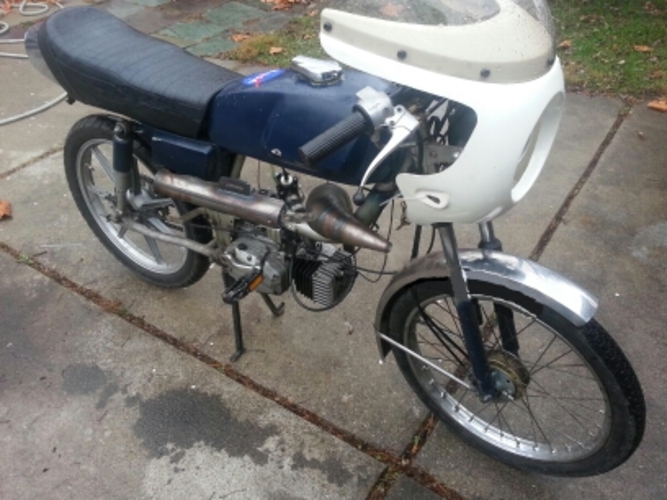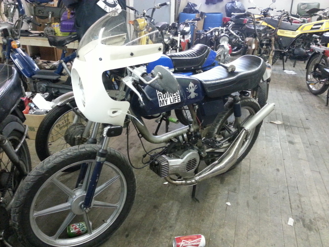 General 5star v1, Puch Monza fairing (honda cb125s headlight) and seat and 7 star mags. 80cc polini matched to case intake and exhaust, grahams hc head, clutch drilled and welded w blue springs, 21race phbg w 21mm tedfab intake. Originally ran puch simonini calibratta exhaust. Recently replaced w MLM's through frame magnum prototype cali clone pipe. Before