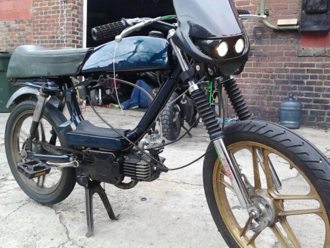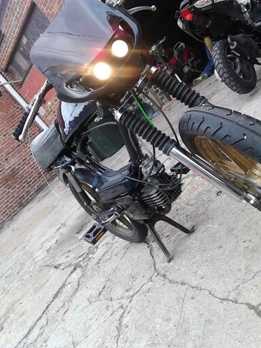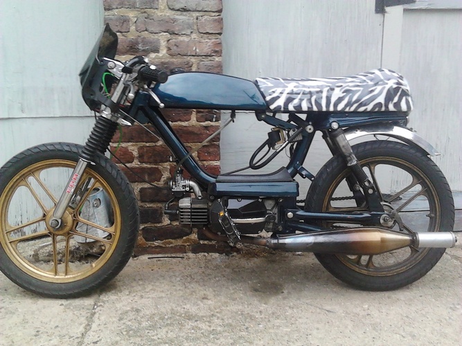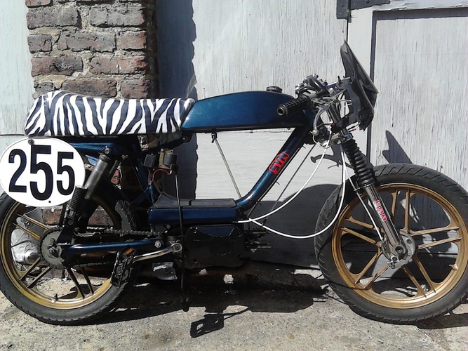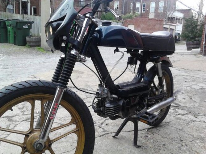 1978 Garelli SSXL. Picked her up for a ridiculous barter. Everything chrome matched the brown paint job until I hit it with a bottle of parts blaster and wire brush for a day lol. Ditched the round headlight, replaced with treats jigster headlight fairing, pietcard 12v ignition and e50 hi rev coil, green/micha blue pearl paintjob, clubman drop bars, gold Build dedicated to my grandmother who has passed away, Helen La Femina:) Grimeca 5 star rims with 2.50 Sava tires, re-geared, new seals, bearings, & rubber clutch bushings, Polini kit, PHBG 19mm carb, Polini 19mm intake, MLM pipe, ebr forks! Smog Squadddddd