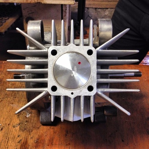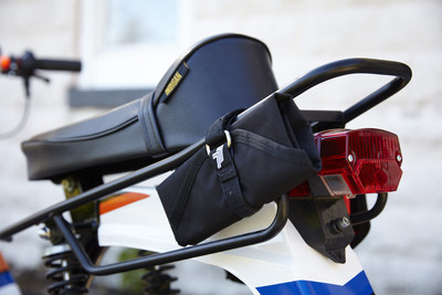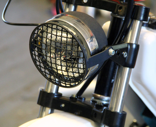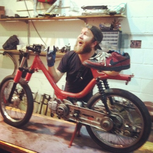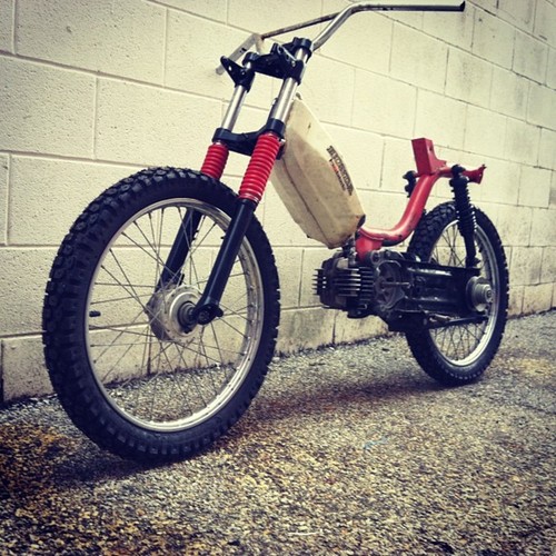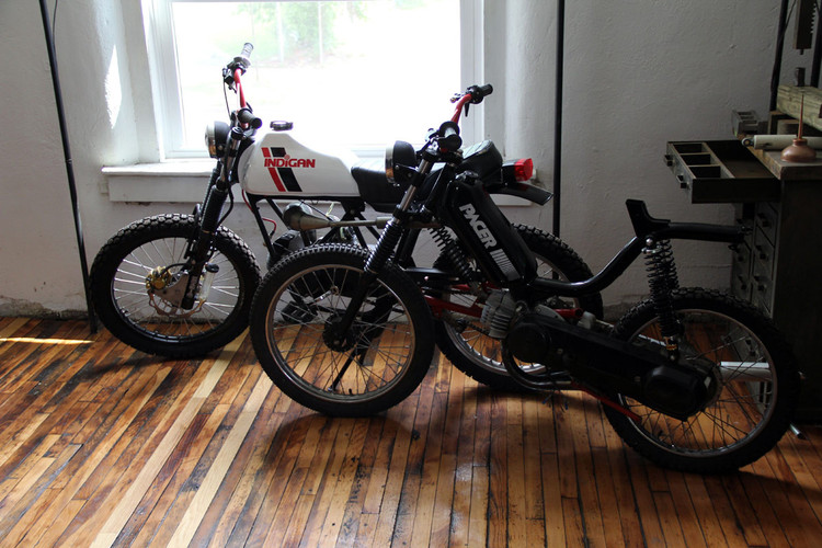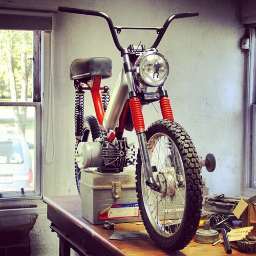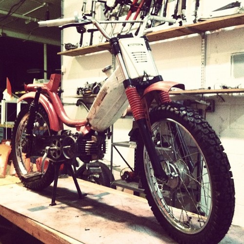 Herbi is a Honda with Derbi upgrades all around. A really tall suspension lets Herbi go over almost anything. We went with a 19 x 2.5in Pirelli front tire, with a 17 x 2.5in rear Shinko for really good on road off road capabilities. With the CDI unit in place, we ran a Halogen front light with LED rear housed in a ULO tailight assembly. For luggage we used the 77 Tool Roll and Rally Pack, made for us by the talented Montrose Stitchery. You might notice that the kickstand is insanely long. To clear this tall bike we needed to extend a stock Honda Hobbit kickstand about half a foot. Stock crank arms, and Cult Nylon Pedals seemed to be a good match. Co.St.A Front forks and shocks had been riding the dreambike shelf for forever waiting for the perfect build. Again, they almost ended up on the Diablo.