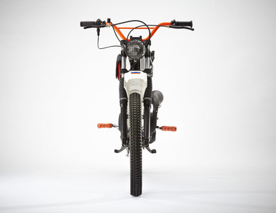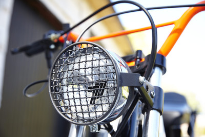 We put the Derbi Metrakit on with very little fuss or muss by using the 12mm crank. Indigan seat, and racks all around for easy schlepping of gear and bike. Bars are a set up Indigan prototype bars that were also used on the Diablo. Basic universal leverset, and teflon coated cables stop it really well for drum bakes. Pipe started off as a Ninja G2, and was modded up by our buddies at Spring Valley Motors. Insane Dayglo Orange bars and subframe was coated by the Ghost RIders Simon Earley, with the frame coated by Joel Leo. Decals were cut for us by the Decepticons Captain Nick Jobbit. All the other odds and ends and final assembly was done by Dan Kitchen, with motor built by Brendan McGinnis. Concept and Design by me Dan Kastner. It takes many hands to get a bike wrapped up. Thanks to everyone who helped on it.