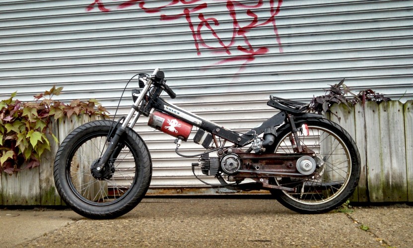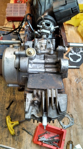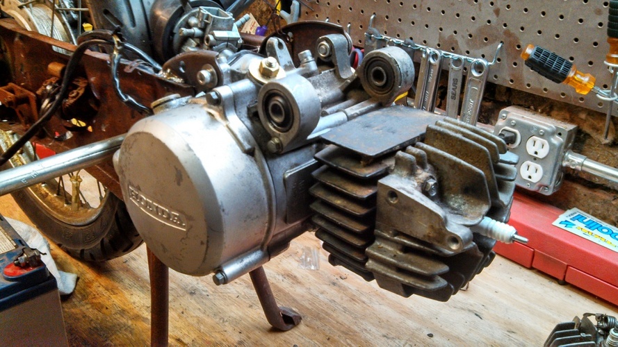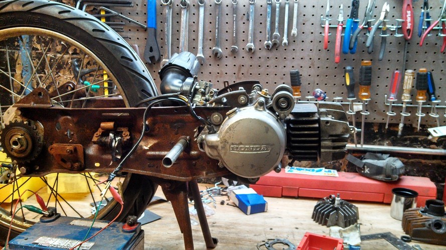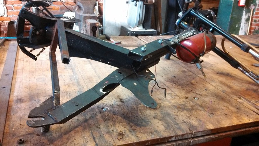 I salvaged the old top side of my "Solepuch" and made a hobbit subframe mount for it. Then found a burnt out shell of a hobbit subframe to put on it... reenforced the crap out of it. Mashed up Nu-50 / PA-50 drive train, electric start, Athena, PHBG, Weak-ends and a massive front end to keep the thing as grounded as I can.