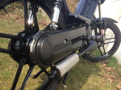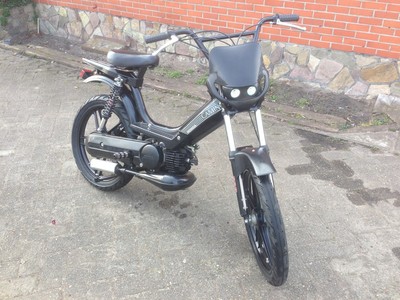 I've made it ALL BLACK now, with satin black Grimeca wheels and the Polini cilinder had been changed to a Biturbo aluminium kit. Also has the stock variator been changed to a customized scooter variator, with is far superior to the stock. Somewhere in the future this Camino will get another front suspension and a front disk brake. Cause if it goes too fast, it has to stop real fast too.