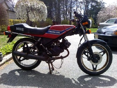 stock mb5 I picked up for 300 bucks. TITLED, needs a ton of work but the motor makes 150psi of compression cold and its got spark so it should be a ripper soon ;) EDIT: SHES A RIPPER!!! still needs a front brake caliper and tires and tubes but she runs, rides, and shifts fine. EDIT: finished the bike, still looks like a rat but its got lights and brakes and drives lol, 55mph bone stock. did 60mph down a large hill. fast for a little 50cc lol wish it were cleaner and the title was in check. :/
