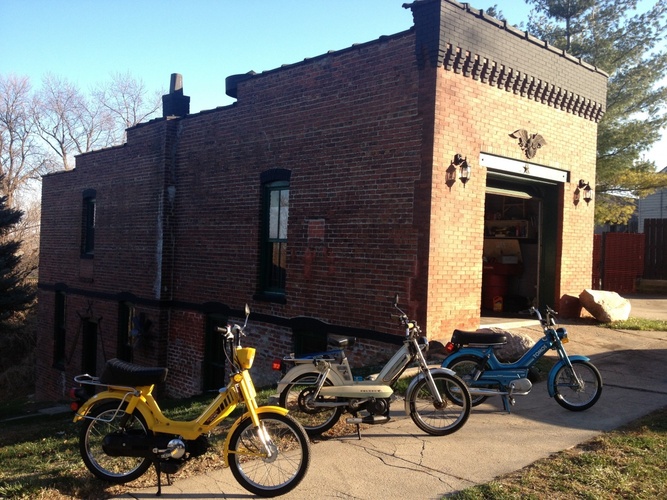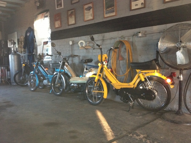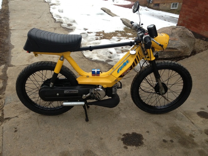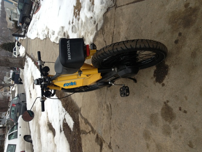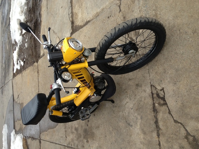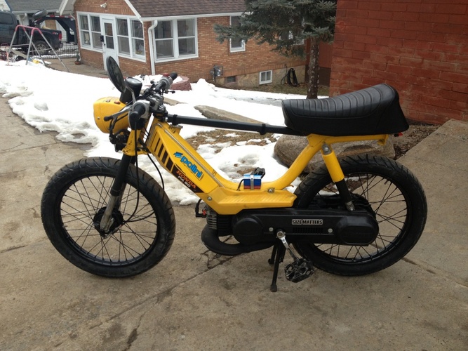 Honda pa50II 70cc,21 mm carb, carbon fiber reeds, 12 volt CID , Proma pipe , relocated headlight, lowered bars, carbon fiber wrapped frame stiffener. Just added 2.75x17s and black wheels ,removed fenders and led tale light and coming up I have another Hobbit frame that I have moved the engine mount 3.5 inches rearward and the seat mount 2.5 inches rearward also relocated the shock mounts and a welded top tube.
