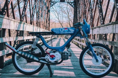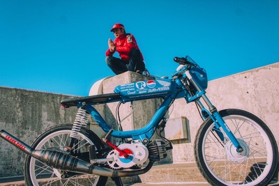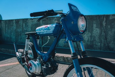 Decked and ported stock Flatreed cylinder on a hobbit motor paired with a 15sha clone and crank pipe. Stock Derbi six roller, treats belt, pedal lock out, Peugeot EBR forks, OEM CDI. Built for stock class in MopedGP.