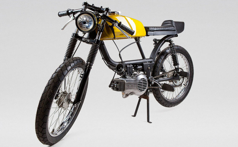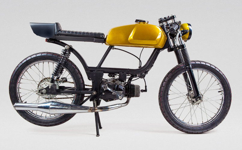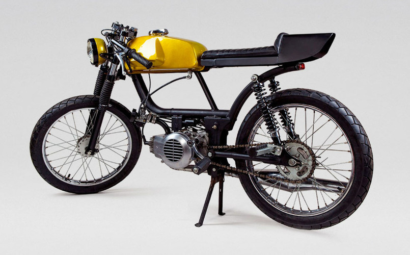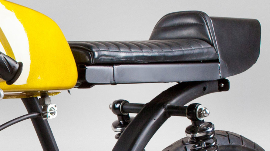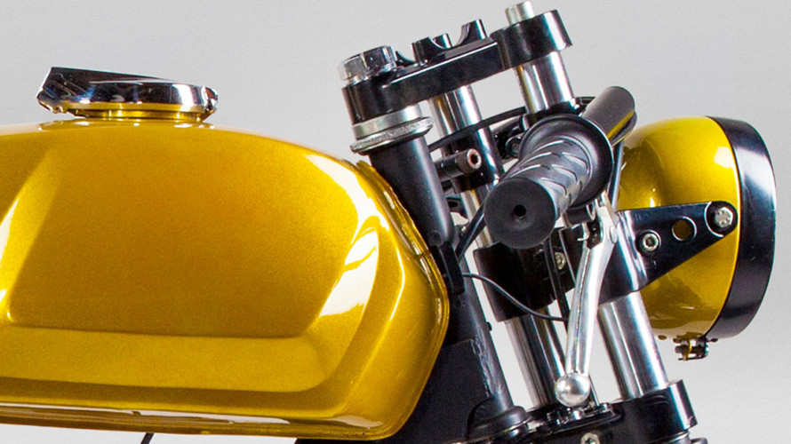 This sweet ride started 100% stock. The engine was rebuilt and the suspension upgraded. We streamlined the frame—removing unnecessary mounts and brackets. The seat was a custom prototype made by Anchor Racing and upholstered in slick, black leather. The bike was powder coated flat black and a candy honey metallic.