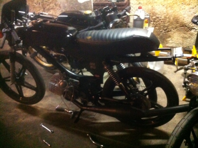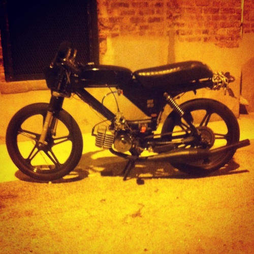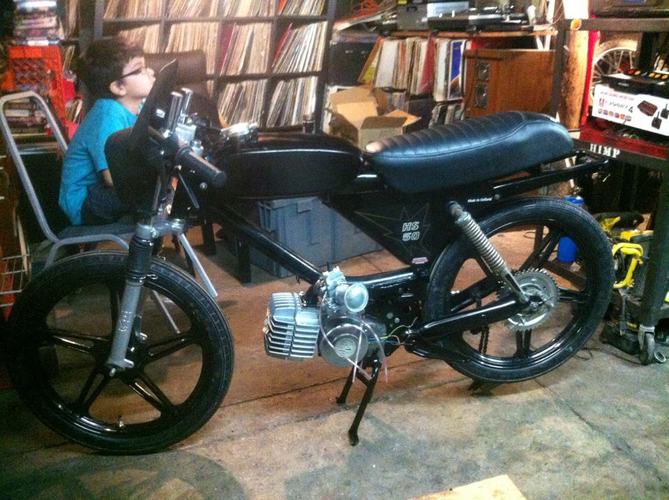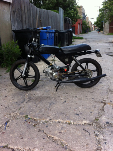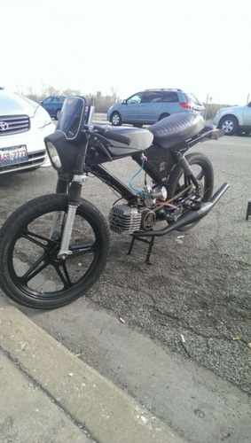 Batavus Mobat Hs50 with an E50, Gila Kit, Mike Thomas intake, Mikuni TM 24mm Flatside, Malossi Velocity Stock, Polisport fairing, reupholstered seat, clip-ons, 17" 5 star angled Bernelli wheels, Supreme Deluxe Ebrs, and hot rod tires.