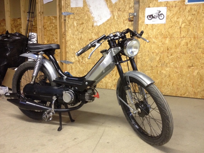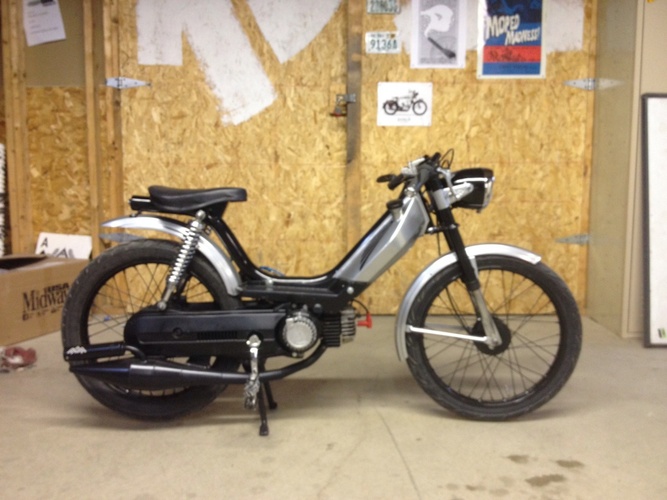 this is the Reincarnation of my red Hobbit http://garage.1977mopeds.com/build/1584/ New Motion Left H95 for mind blowing power. pull start/bump start. Custom Craig Hobbs saddle. Indigan Bars. powder coated frame tank and fenders. so to install Malossi rear gears.