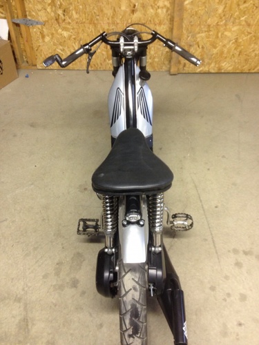 The top speed so far has been 64 mph. I still need to put my Molossi gear box on. Its a Puch seat pan custom foamed an covered by Craig Hobbs a fellow Ghost Rider