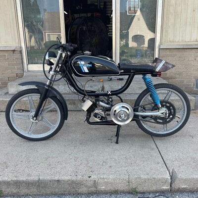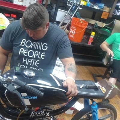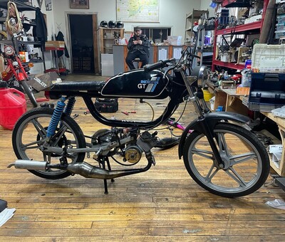 Jokes, there is no glory, this bike is a disaster, here's the set up.... Teknix 3-transfer cases, stock crank, Malossi 64cc cast iron cylinder, custom cnc'd head, Athena reeds, spigot mount intake, 21PHBG, modified SPX Leo Vinci pipe, Doppler ER3, Doppler Clutch Pulley, Malossi belt, Le Partie CDI, Polini engine spring. Decent engine set up, on a wildly underserving frame, the subframe seems to be a copy of the Malossi, but the spacing is wrong. To get the belt alignment right I had to have the ER3 machined out so that I could space it out to match the clutch pulley, I also had to grind down the pedal shaft thingy on the frame to get the pulley to sit closer to the frame. so once I worked all that out and tuned the bike, its a rocket, does non-ironic wheelies, that SPX pipe has 0 top end in it, but the lows and mids, topping out between 45 and 47mph. Oh it also has a custom dent in the tank, from when I got real pissed and punched it, kustom.