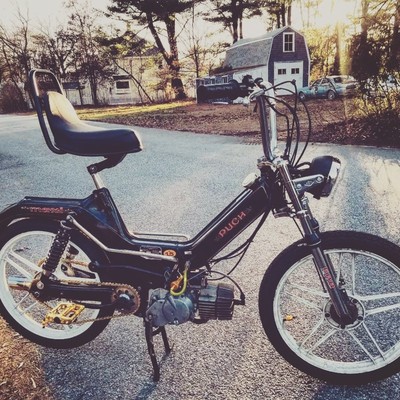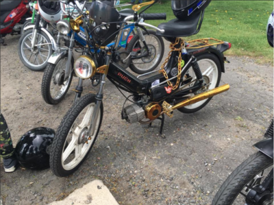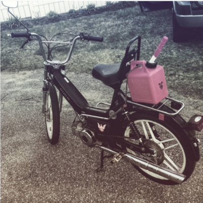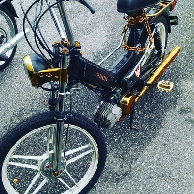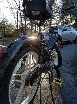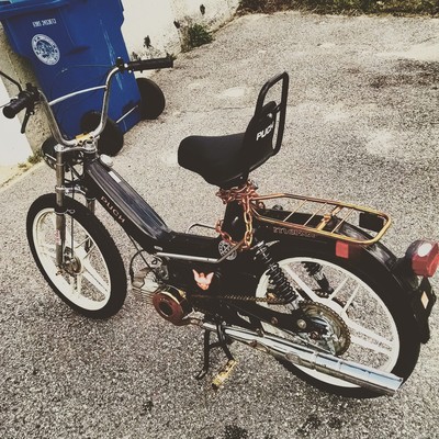 This was my first bike ever. I had purchased it from someone on craigslist after coming home from an adventure in Chicago. While i was on this trip i had met some really amazing people who were all into mopeds and i had instantly got addicted to these things. when i first bought this bike it had flat tires and the front controls were all messed up. I either replaced or painted most of the aesthetic pieces of this bike over time and am continuing to do so. Eventually i want to upgrade the engine and carb completely so that i can et the most out this project.