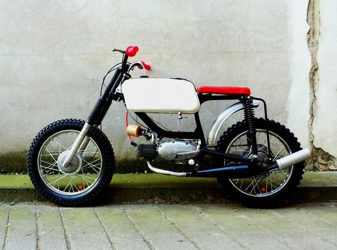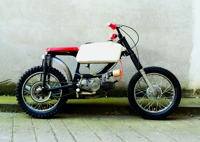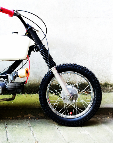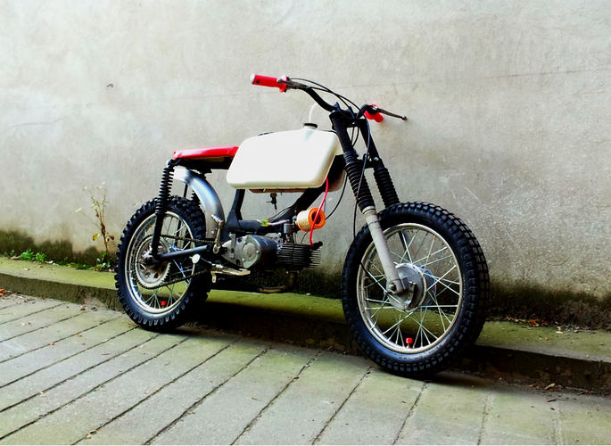 mods: reinforced frame, Simson Enduro front fork and rear shock absorbers, 3.00"x16 cheng shin tires, Progrip 794, modified original handlebars, Simson sport expansion chamber, 11 teeth front sprocket, Suzuki foot pegs,