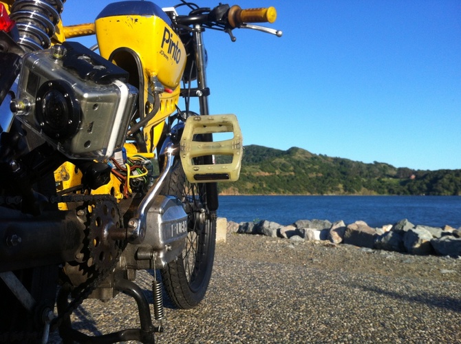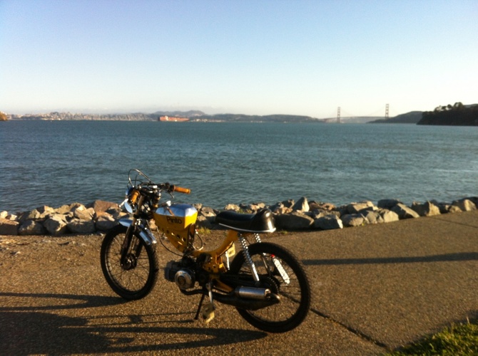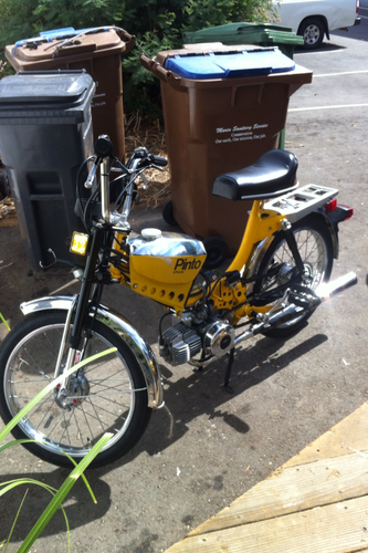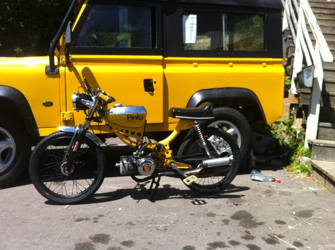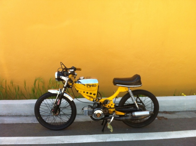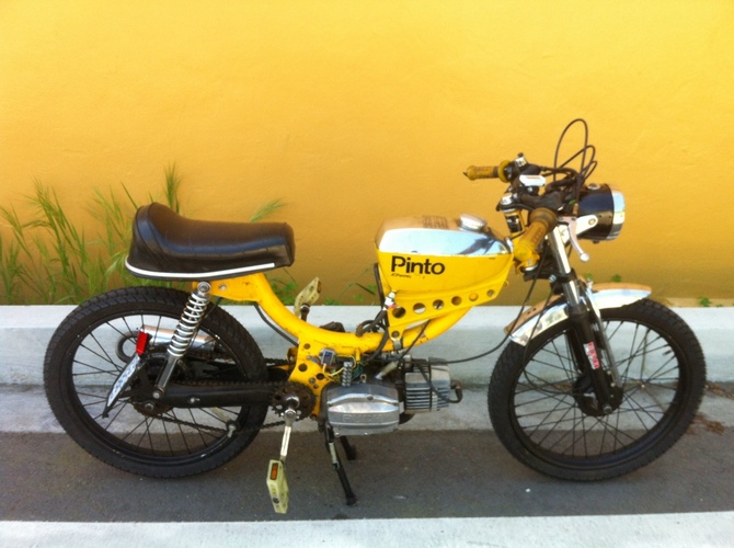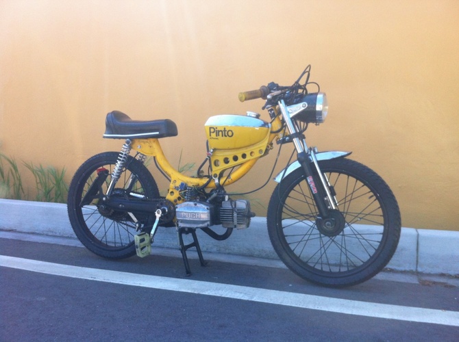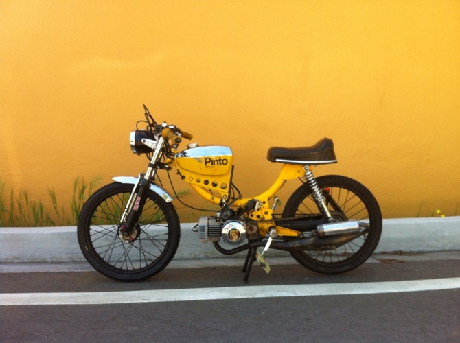 1977 puch pinto- cut seat post, fabricated seat mount, raised gas tank, restored vespa bullet headlight, club bars, ebr forks, cut front fender, rear yet to be put on, springs, atomic plate and led light.black rims with clear coat and ofcourse the porsche engine