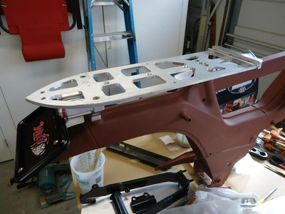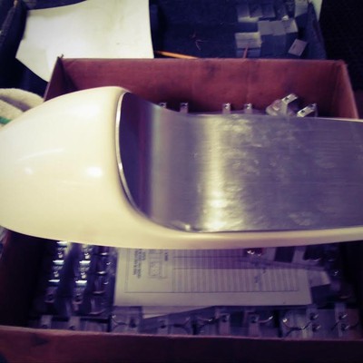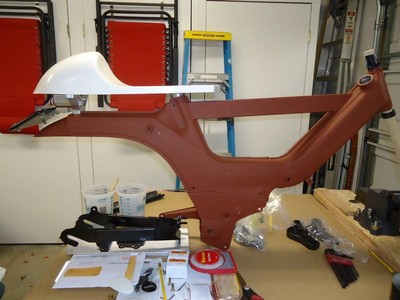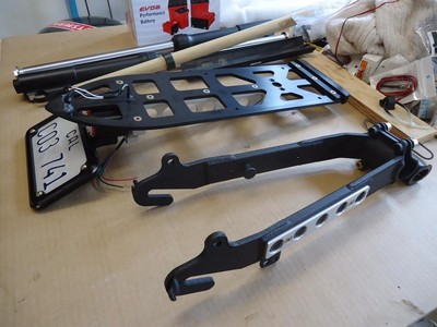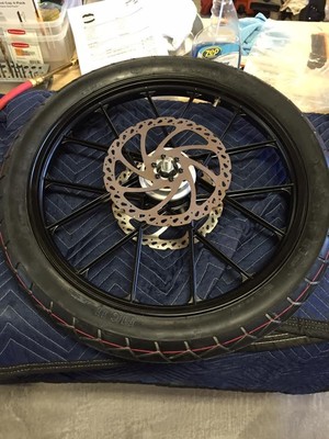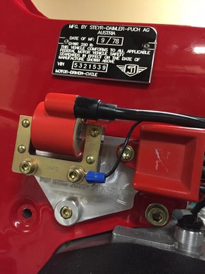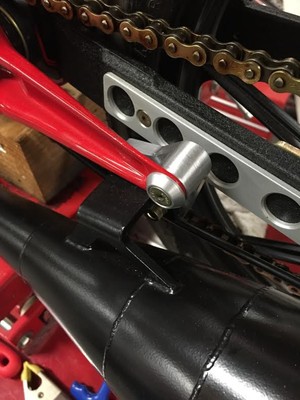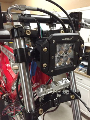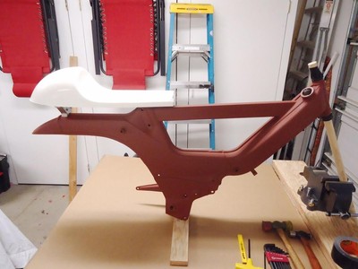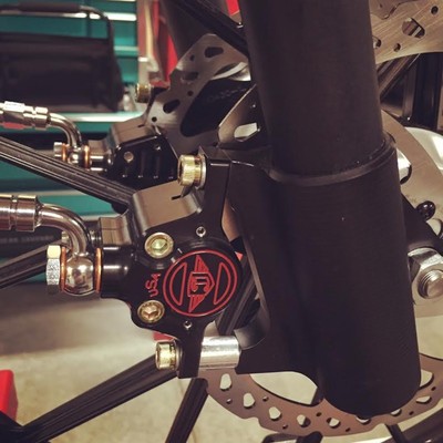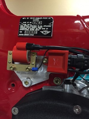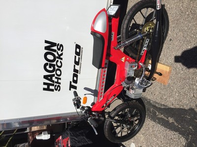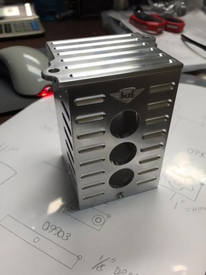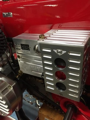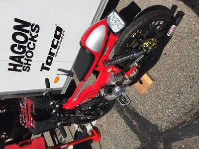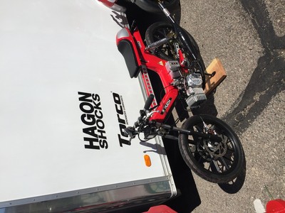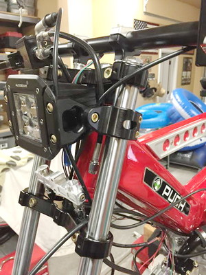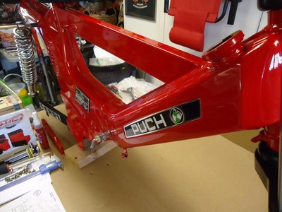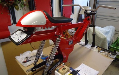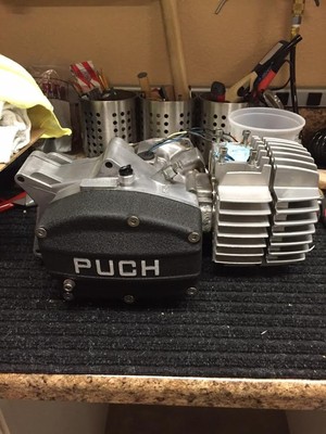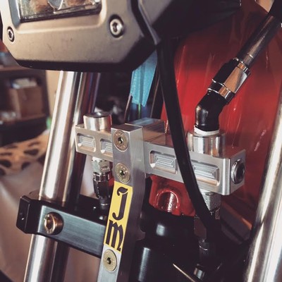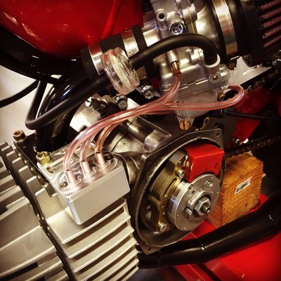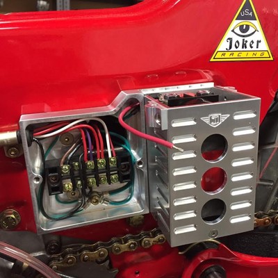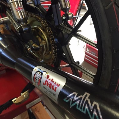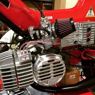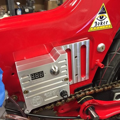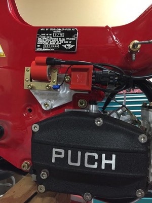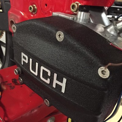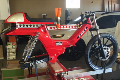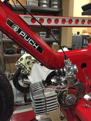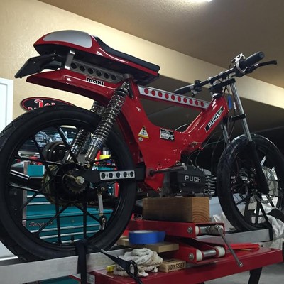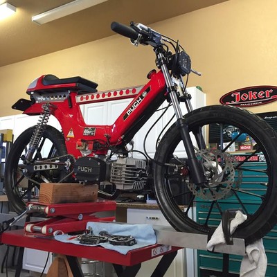 This is a Joker Machine moped project bike, built from an old '78 Puch Maxi sport MK II that was bought off of Craigs List back in July of 2013. The frame has a 1" x 2" 4130 steel tube support bar with a set of billet aluminum trim panels. The bike has a full array of off the shelf billet hand/switch controls from Joker Machine along with one-off CNC machined pieces along with various performance parts bought online. It sports a set of Hagon (British) stainless steel shocks, modified Yamaha PW-80 front forks fitted to modified Puch "Snowflake" cast rims with dual stainless rotors, with a CNC machined cross-over manifold to feed the dual piston billet Joker (racing bicycle) hydraulic calipers. Motor built by Paz Performance: (Gila 74cc with HPI ignition / black wrinkle powdercoated trans case). Has an MLM 3" wide capacity tire, black wrinkle powdercoated swingarm with custom aluminum side panels. Has CNC machined 1/4" thick seat support plate and fiberglass "Cafe" style seat cowl with an aluminum seat pan wrapped by a Saddleman custom made padded seat. Custom CNC machined LED tail / tag lights incorporated in the rear section. Has a replicated PUCH S.N. nameplate milled out of aluminum and CNC machined text with "JM" wing logo added. Tires are SAVA 17 x 2.5 racing tires. Has custom billet headlight brackets affixed to an "Auxbeam" headlight and a custom machined HPI coil & CDI box bracket. Has an elaborate electrical housing milled out from 1" thick blocks to contain the wiring terminal block. A digital voltage check meter is incorporated into the outer box section that allows checking of the Ballistic 2" SQ. battery with the push of a button. Just added a custom billet carb overflow tube "catch-can" mounted off of the intake manifold and a fully CNC machined out from a billet chunk: (5.5" square x 2" thick block) timing cover. Has Biltwell "Recoil" style hand grips on shortened 25" wide drag bars. Has an MLM "Cali" exhaust with billet mounting adapter bracket for Puch Maxi frame bracket.