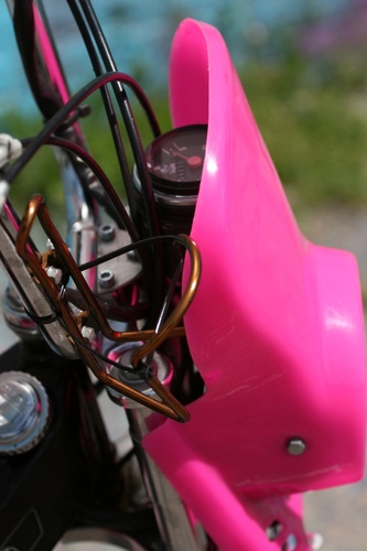 Ken is my second boy. A stock Maxi Luxe that I acquired in Ohio. The Barbie pink accents, hence the name Ken, are NOS Fast Arrow parts shipped from the Netherlands, thanks Gerrit! The cup holder comes in handy for drinks on the go :D The EBR forks are definitely needed as Ken is my daily rider, and Detroit roads and potholes are not friendly.