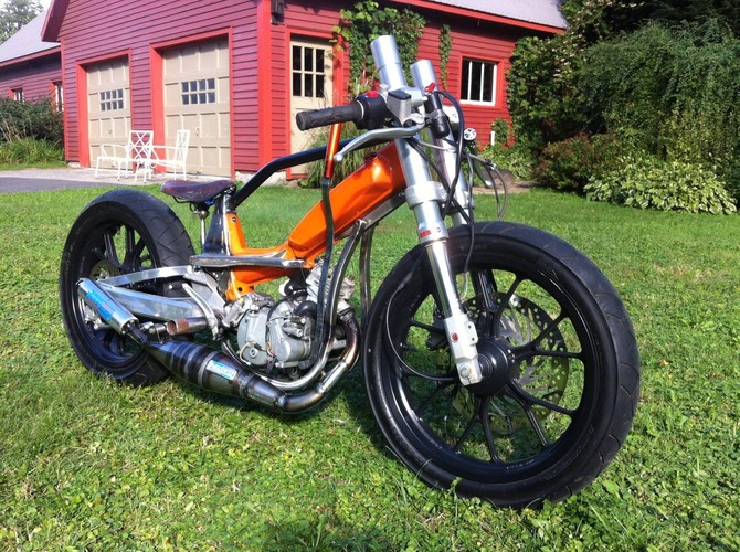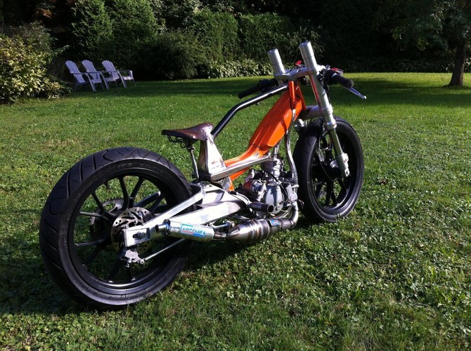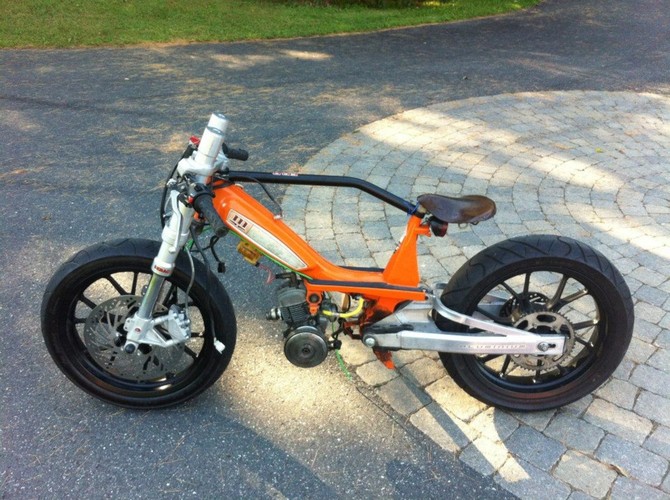 Inspired by the Salt Flats, 1970 Motobecane, chopped and boxed frame, GPR50 front end, swing arm, engine and wheels. 80cc Malossi, carb, custom intake manifold, Custom subframe/engine mount, 40s Motobecane bicycle saddle, Modified Doppler Motobecane pipe, Jockey shifter...!! Tons of fab....built with plans on running Bonneville in 2015. Still under construction!!