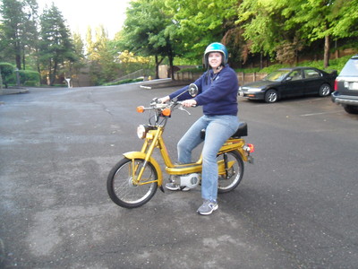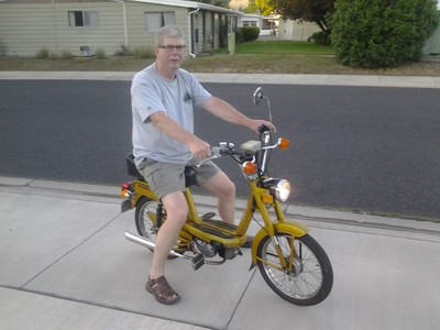 This is mostly my wife's bike that was given to us some years ago by our previous landlord. It was a one owner bike when we got it. It had been sitting up at his mountain cabin for about 20 years and he said if we could get it running we could have it. We flushed the fuel tank, added new fuel lines and had it running that day. Since then we have only done some mild modifications including a 75cc cylinder kit. Kim's Harley Davidson riding family are currently stewarding the bike for us and I hear that all her dad's riding buddies are a bit jealous of him and now want mopeds of their own! He even entered it into a recent motorcycle show and it won second place in the women's division! It has it's original factory metallic gold paint, saddle, handlebars, and cat eye blinker kit. There was even a windscreen that was an extra dealer option that we never used for obvious reasons. After we got it up and running, we cleaned the chain and replaced the rear wheel barrings and both tires. It's running great and will even pop a wheelie if you get it going just right.