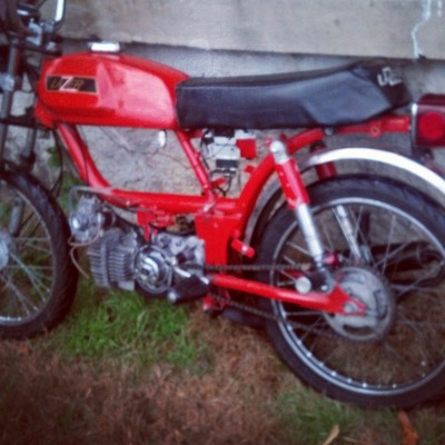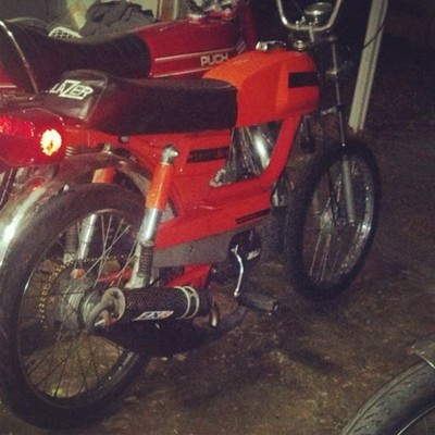 Minarelli v1 with a stock needle bearing crank. Lightened clutch bell with needle bearing. Hammer clutch with red springs. Custom Puch kit spacer by Motomatic that I case/kit matched for the Puch Polini kit. Malossi 4 petal reed block with a custom 24mm intake by me. Mikuni TM24 flat slide carb and LBMopeds carb coupler. Hobbit HPI mini with a custom taper adapter and custom stator plate (before HPI released the V1 HPI, I had to have this one made for me by the Wizard Naz). I had to hand rewind the light coil because it was shorting out in the windings (no continuity), and now it is MUCH brighter (if you can even imagine that, rewound coil is on the left in the picture below). Exhaust is a Leo Vince ZX-R scooter pipe for a Zuma that I cut original header off of, made a flange and header, welded them together, and then re-welded everything (shortening header by 2" with my own header). Gearing is 11x44. Top speed is 51mph at a million rpms. This bike has INSANE low end and awesome mid and top end. It's a really great bike to ride around the city.