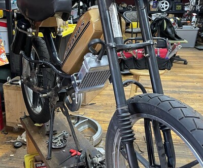 103 powered Batavus! I swore I wouldnt build anymore French bikes for a while, then Zack from Pikes tempted me with this dream bike! So I broke it down to all its bits and shined em up, re-painted the subframe, then got down to it. I had a sweet long conrod Malossi crank with spacer that I paired with a liquid cooled Doppler 50 kit, Teknix cases, Polini Circuit pipe, Polini engine spring, Mini ignition, XK80 radiator, overflow bottle/no pump, Omega variator, Doppler Clutch Pulley, Malossi 4-petal reeds, 21PHBG, and some sick rims thanks to Dusty Rim, Malossi belt. Dude this things pulls like a monster! I was lucky enough to have one warm day before they laid salt on the roads to rip it around, never went over 40, I was mostly playing with the engine spring and testing my thermo system, as with the rest of the bikes on this list, I will be tuning the carb come spring