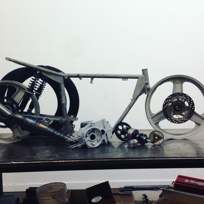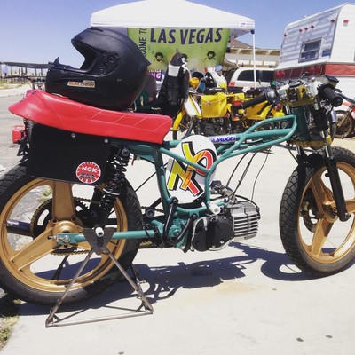 Lee's Moped's of Los Angeles moped GP track bike. Frame to be all hacked. Aluminum tank seat. Gnarly GILA with Tillotson on top. See you at the races.