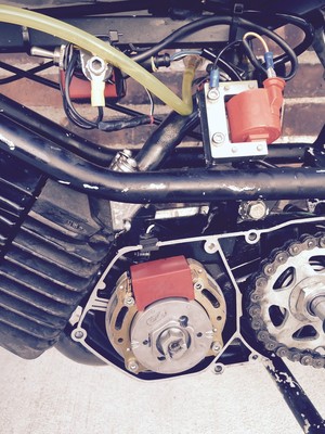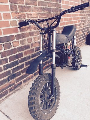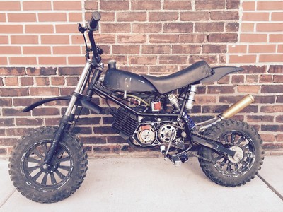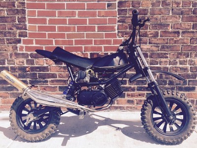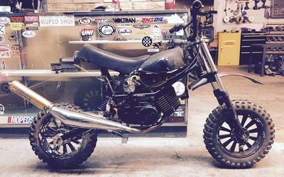 The Build is a Tomos TX50 that has an A35 stock 50cc engine mounted and ported. It breaths through a 4 pedal Polini reed block and PHBG 19 carb. The exhaust is non other than a lovely Bi-Turbo A55 fabbed and mounted. The ignition system is delivered by an HPI inner rotor as well as an upgraded Paioli Mono shock that is fully adjustable. This abomination will also be ripping the Lucky Tomos Clutches 1st gear and a modified 2nd gear.