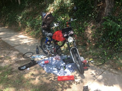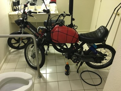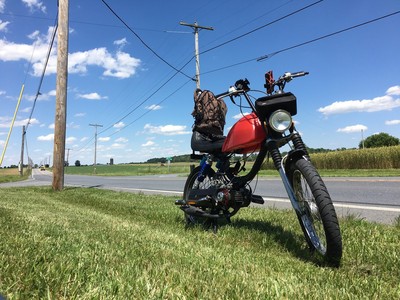 Stretched frame, Puch Magnum stock hydros, desert dirt bike gas tank.