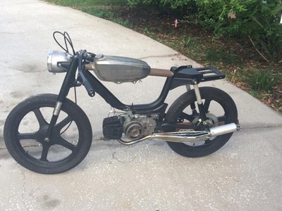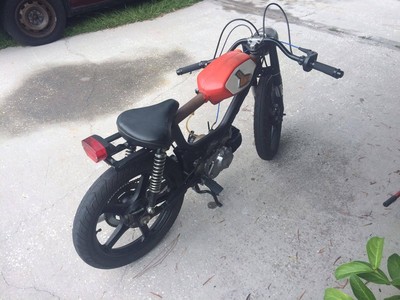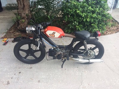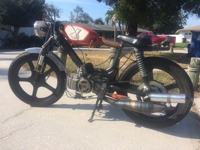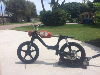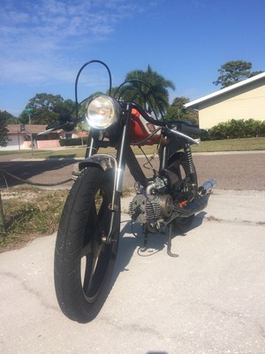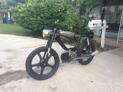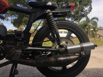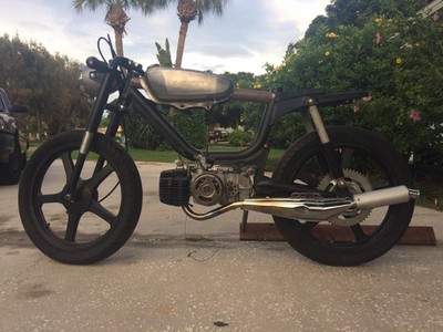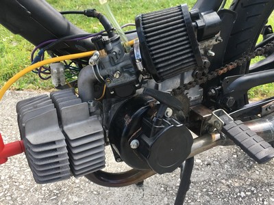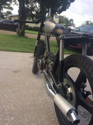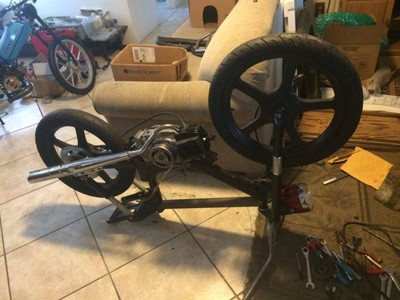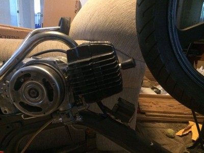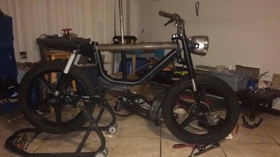 Not gonna weld the top tube till I decide on a tank... Fabbing the exhaust bracket now, just got an Estoril side bleed and finished the 70cc build. The engine in the pictures is now the center piece on my dining room table.