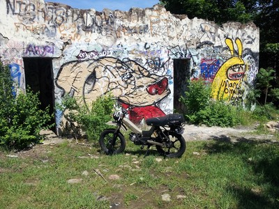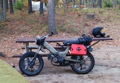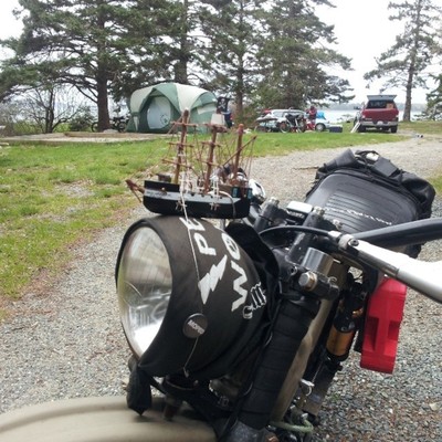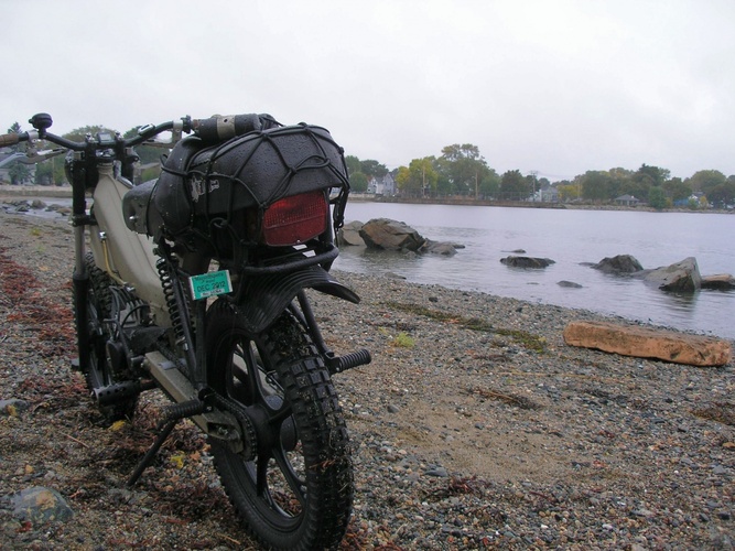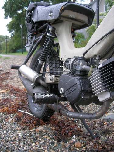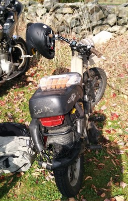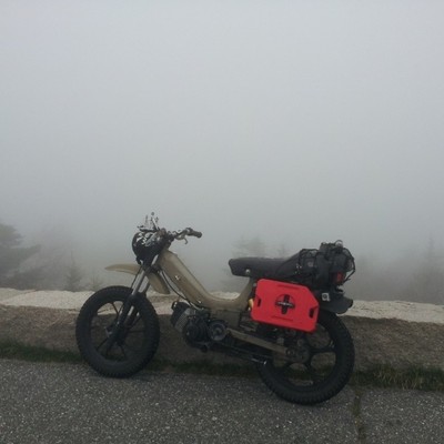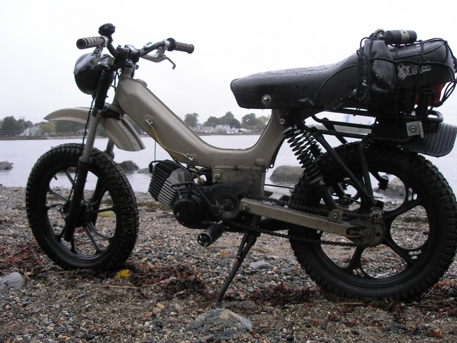 Built to be durable and then some. Originally a Mars project with box steel swingarm, motorcycle seat, campy euclid levers, and kx80 fork. I stripped it back to zero and added fresh paint, fender/mudflap, halogen spotlight, gas gauge, tranny fluid sight glass, bike computer, gear rack with pillion pegs, rock solid wiring system with waterproof switches and a much needed kickstand. Comfortable on and off road, night or day, good or shitty weather.