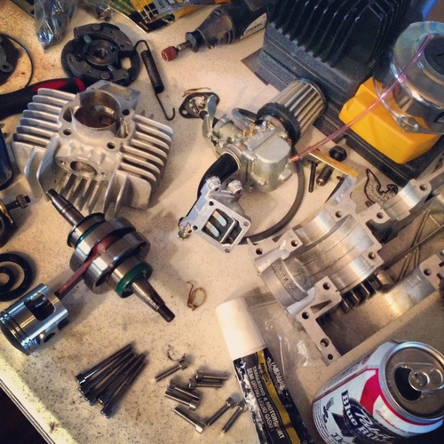 It's an adult sized maxi with magnum xk suspension front and rear, elusive swingarm included. Built this one to get me to and fro quickly and reliably. Everything is custom. Paint, ported motor build (tomos dmp head and tomos 7mm studs), 103sp euro wheel rebuild and retrofit, temp gauge cluster, twinsie wsl exhaust, taillight mount, chop, etc etc. Melted the stock korado crank after a couple hundred hard miles. Switched to alum stuffed and 19 tooth front sprocket, 48 rear (to clear the frame w mag suspension). It's a nice ride. Unfortunatly, it has been dismantled and parted out.
