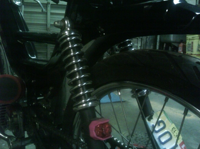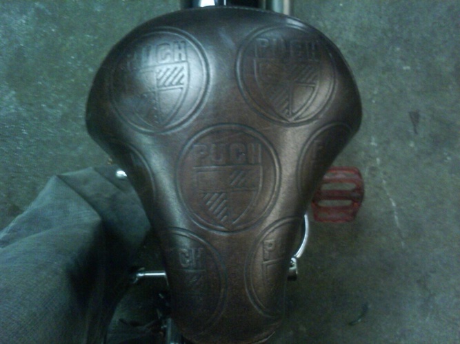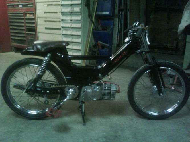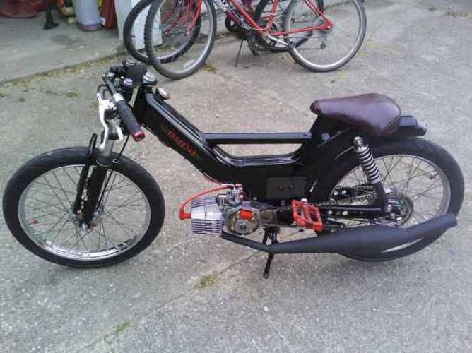81 Newport 2 e50 swap.shortened rear fender not just hacked. Ebrs sealed wheels, toptube, porche black paint with 5 layers of clearcoat,polished aluminum rear inner fender, clampon bars my design, anodized black aluminum top tree and access panel, decals under clearcoat,led head and taillight, custom tooled leather seat dyed antique mahogany, all unnecessary mounts shaved and filled,Hutchinson tires,lusito levers,fond De jant rimtape,macneil valve caps,treats pipe shortened baffle,74cc parmakit,24mm flatslide,superstuffed crank,homemade intake, uni filter,hpi ignition, lightened clutchbell,bubble cover, magnum pedal crank,eastern pedals, ngk plug and wire,repsol2t oil,110 octane leaded race fuel,scott grips,odi grip stops.