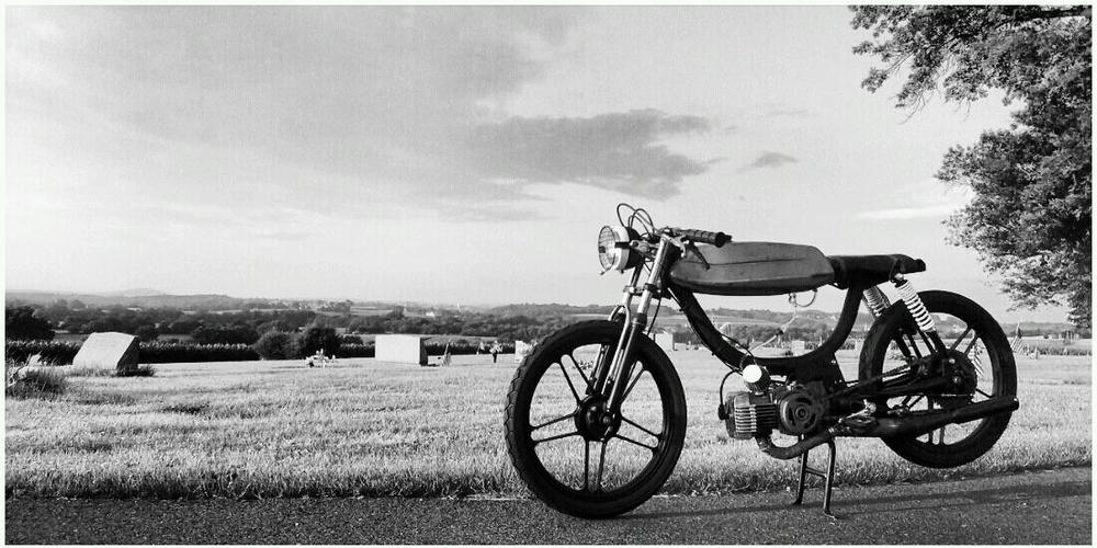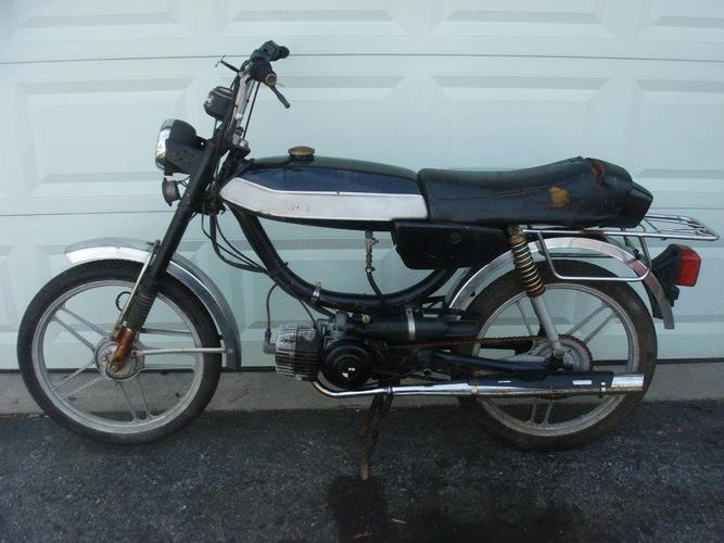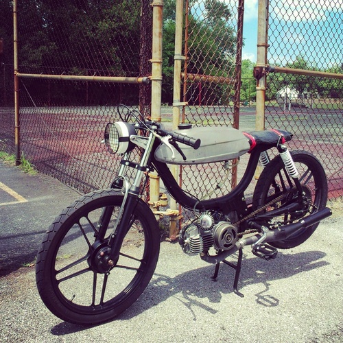 1978 Puch Magnum, torn down and rebuilt. Modified the frame slightly. Lowered on Maxi-length suspension. Wheels powder-coated. Engine rebuilt, fresh bearings and seals. 50cc TCCD kit, hi-comp head, 15.15 SHA, Techno Boss pipe. Hits about 35mph on a flat. Rides solid. Runs like a dream, but a rolling work-in-progress nonetheless.