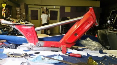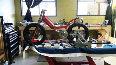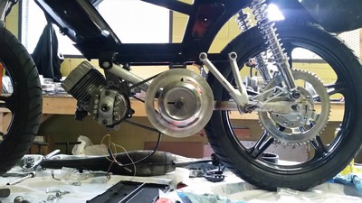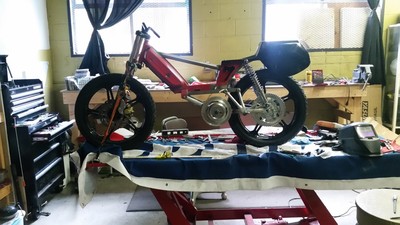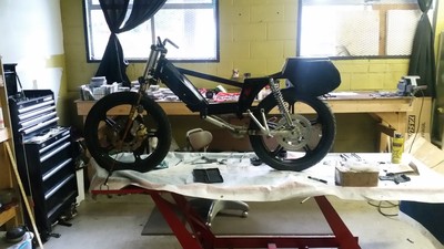 This was a customer build for a new track specific race bike that I built on a budget with a supplied pre-assembled engine and supplied specific frame parts. This bike was built over 4 days from scratch for the opening weekend of the Portland, OR moped race season. Some of the more interesting details are the metal for the cross bar is 1mm wall steel tubing used for bicycle frames (so much lighter than normal cross bars), the rear sets are from a Suzuki Bandit, the tires are 2.75x17 Heidenau K56s (which are not easy to fit in a Peugeot subframe), and the seat is a custom fiberglass unit. This is the first build of the bike and will be refined over the race season as it gets ridden and improved. So there will be plenty of new stuff as time goes by on this one and I'll update any major changes as they happen.