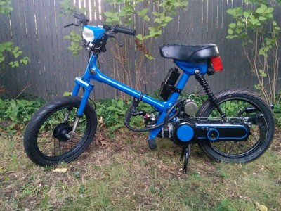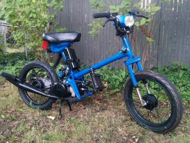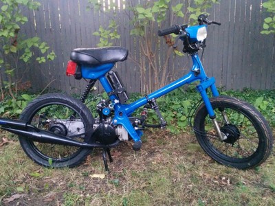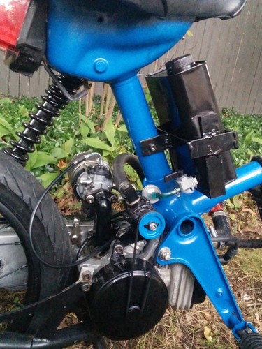 70cc water cooled kit, Polini pump, pull start conversion, powder coated everything, paint stripper can gas tank. Photos show an SHA, but I've since added a VM18.