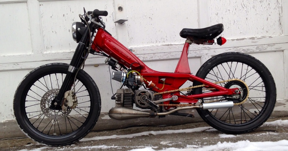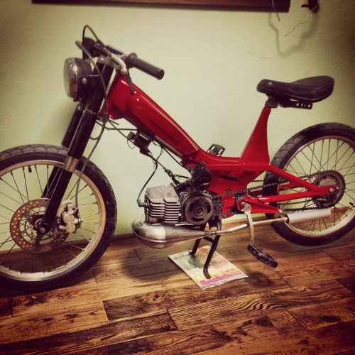 Mobe50 By john phelps · Motobecane 50V · 1979 Added Feb 15, 2014 · Updated Jun 28, 2015 ♥ 6 likes ‹ › 1 / 5 × ‹ › Parts carburetion Dellorto 19mm PHBG -Racing Edition engine Treats 70cc 45mm Reed Puch E50 Super Stuffy exhaust Puch Proma Circuit electrical Puch Stock Ignition transmission Puch Superclutch Comments (8) Tyler Brekke — 11 years, 5 months ago I was starting at this bike for like 5 minutes before I realized what I was looking at. This is so awesome. Derek Stahl — 11 years, 5 months ago I forgot about this bike, sooo good! Dan Kastner — 12 years, 1 month ago Put it up! john phelps — 12 years, 1 month ago i had a pic up. but i took it down.. Chad Sutherland — 12 years, 1 month ago Fairing? Am I high or are youz? I see no fairing Dan Kastner — 12 years, 1 month ago Do you have a good pic of the fairing? Also, I love that you welded the bottom end of a Puch on there. john phelps — 12 years, 1 month ago yea let me know what you guys think? the fairing is a prototype Andy — 12 years, 1 month ago dat windscreen doe