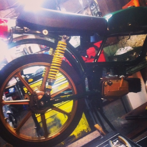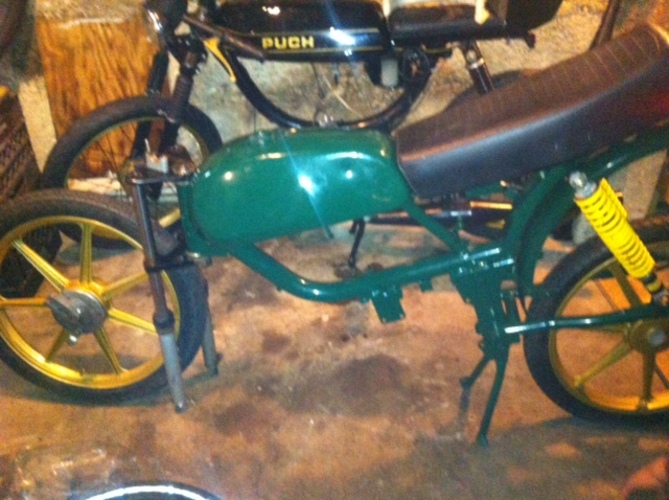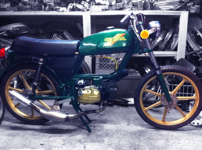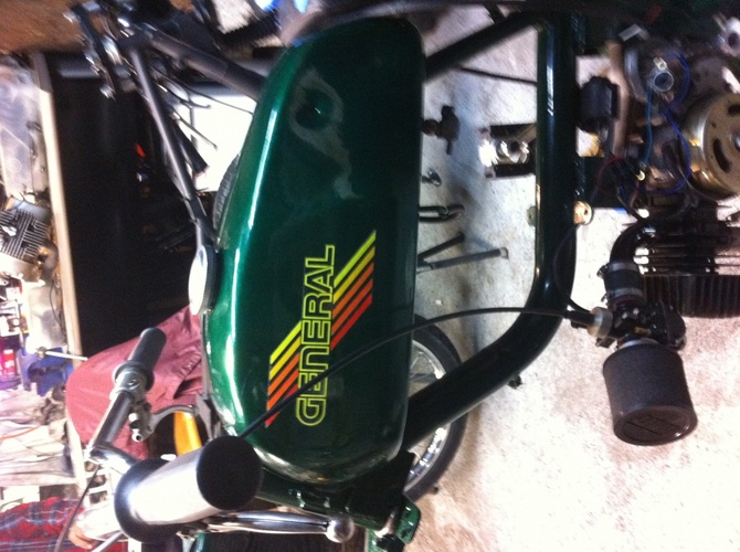 Powder Coating by JTS Coatings Jaguar Green | Gold Sachs 7 Stars | Gold Clutch Cover | Moped Factory High Comp Head | Stock General Seat | Stock General hydraulic forks | Ed's Blue Springs | Geared at 12x34