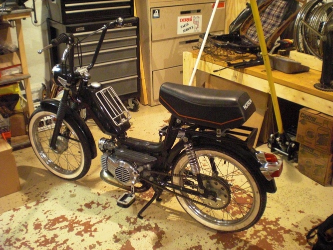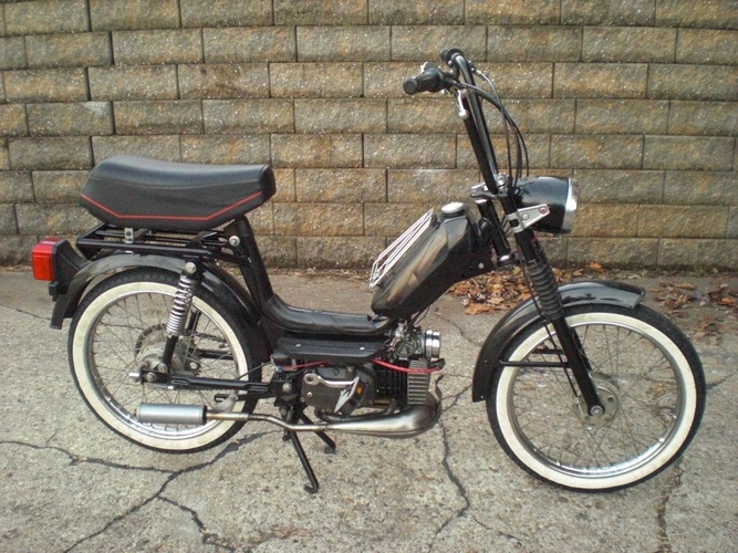 Spoke wheels and 16" Sava white walls for a touch of class, mirror polished aluminum fan cover, vespa tail light and narrowed hobbit tall bars. It's got a rebuilt engine with a 58cc DR kit.