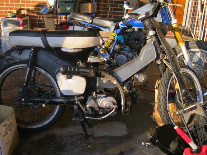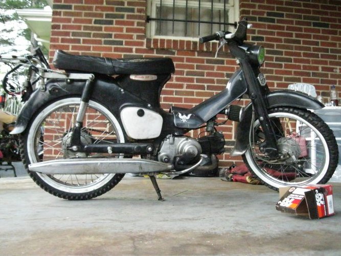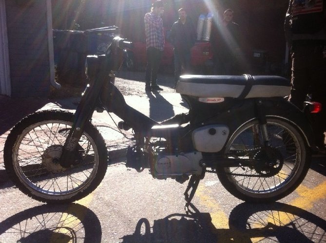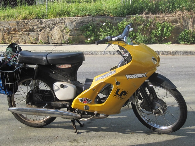 It's just a cub. Exploded the legshields and put a CT90 downtube cover. 17in knobbies w/ whitewall inserts. KNOBBY WHITEWALLS?! hell fuckin yea.