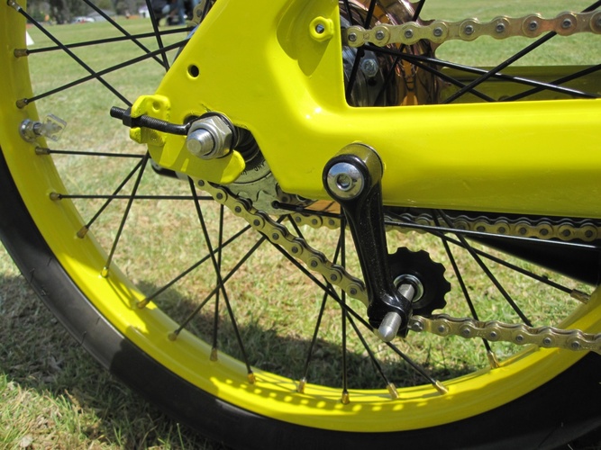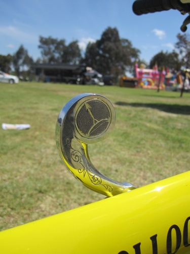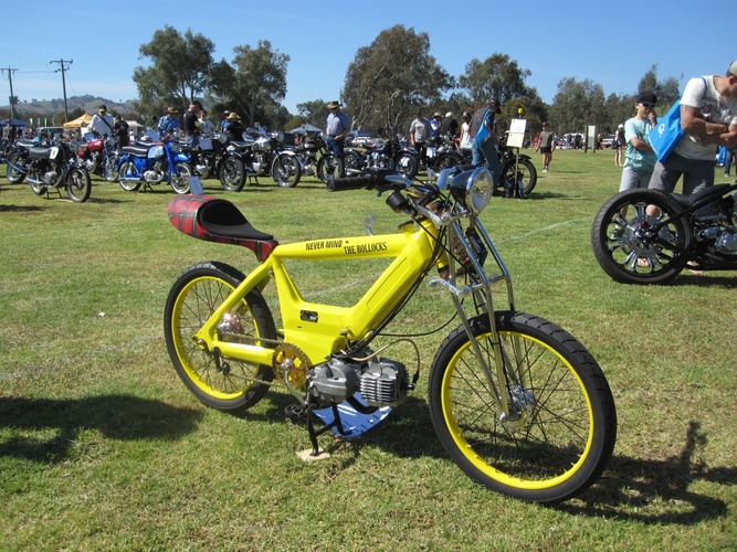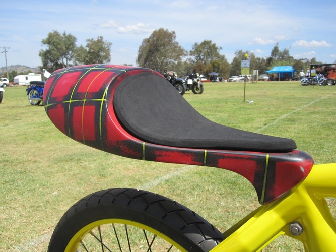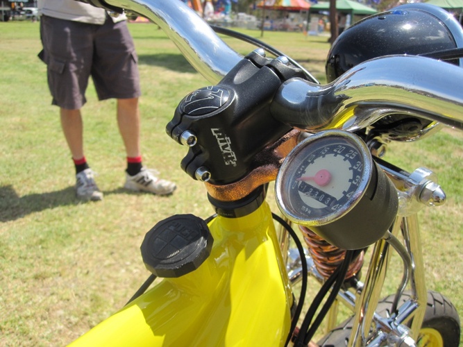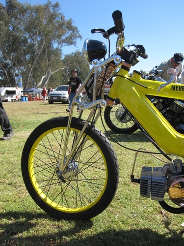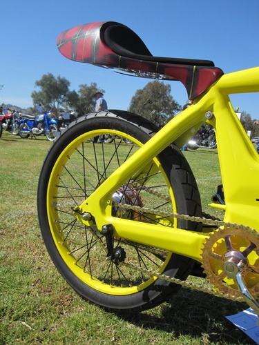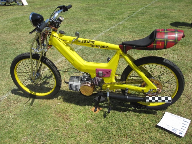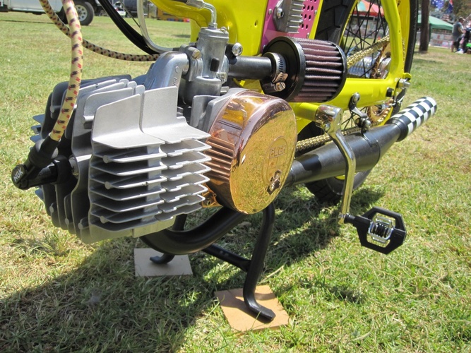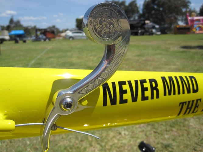 hand built 4130 Cro-moly girder fork, 6160 T6 hand crafted bar links, engraved by Neo Dutch, custom clutch lever, MTB bars, Crank bros Candy EB pedals, Cane Creek flat top levers, threadless headset, new steer tube, tig welded top tube (no fuel), lengthened and centralised fuel filler neck, hand beaten and wheeled, steel seat base, rubber seat pad, polished alloy under tray, twin custom tail lights, 4" headlight and other cool stuff.... all rebuilt by owner, including wheels frame, engine. with moral and tech support from Briton Bees, thanks man.