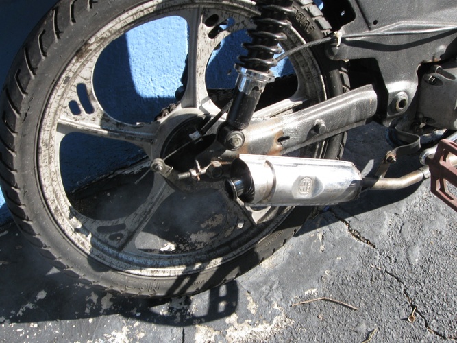 ex-sex trade maxi frame. a35 motor from a bike i got hit by a car on, that was also stolen, seized, then recovered, seized again, kitted, and runs awesomer than ever now. honda fork from blake's trash pile. leather clad gorilla clutches, fog eye jondis beam headlight. tecno churkit cigar pipe. it goes faster than it did stolen. really just one of my down town noisemakers. my ciao was faster, and had wimpier looking engine mounts...