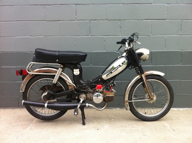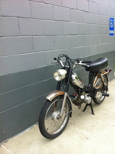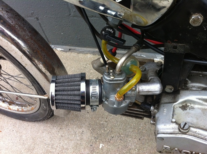 Bought this wreck from an old dude at a motorcycle swap meet for 60 bucks. It was chained to a fence for 20 years. Tires and tubes were rotting off and it barely ran but I was a sucker for that sexy ass frame and killer patina (rust). Replaced the condenser and deleted the decomp valve and it ran okay. Ditched the leaky square bing and clogged pipe for a 15mm round bing and clamp on jammy and it runs great. I had to cut/turn/weld the intake to fit the new carb. Will do 34 on a good day. This is my favorite bike ever and I'll never get rid of it.