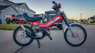 Originally dressed in black, this is a Moped rescue from Kansas City. Picked it up with rotten wiring and rough to not running. So far, cleaned and tuned the carb, tightened the wiring and repaired the little stuff. Zoom! 30 mph on trial runs. Found a BX-31 belt and 3 variator weights in the drive train. Jammy pipe and the all important seat cover on the way; tune-able clutch and VM18 carb in the near future, Hope to hit 40 mph without serious kitting.