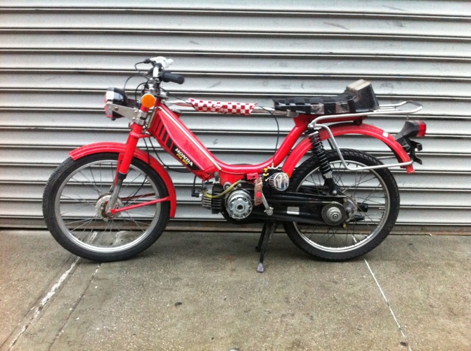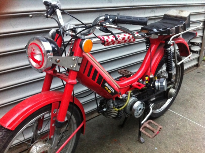Installed a green crank after the first one sheared and the clutch bell/variator shot down the road like a missile. Sporting a DR, TJT, MLM people's pipe like only the truest of players. ML 24mm intake though the carb is only a 21. Shhh...don't tell ;-) Installed some bigger shocks in the back. The fork sometimes likes to lock itself up when I'm on the BQE.