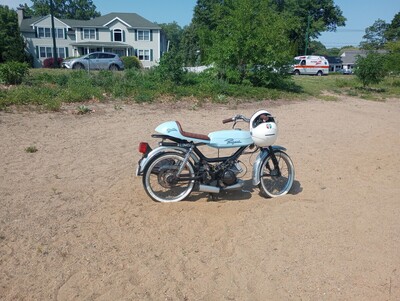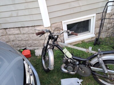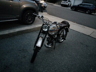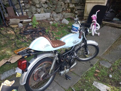 All started when I bought a $150 rusty crusty Jawa supreme with a locked engine. Engine was super seized and had sat without plug for years outside. I decided for an engine swap with a Peugeot, and had the opportunity to swap one of my project bikes (a Carabela) with a Batavus Mondial. The engine was bad as well, so I built a new engine with Airsal crank, T6 50cc cylinder, athena reeds, mlm intake, sha 15.15 and Simonini circuit pipe. I cut and welded the Jawa bar on the batavus frame, got an Amazon seat, did the body work on the tank, spray painted the seat and tank, put some 1953 Peugeot emblems (from Peugeot 203 a car) and a Stella emblem just because of my daughter's name! Wearing new mitas white walls.