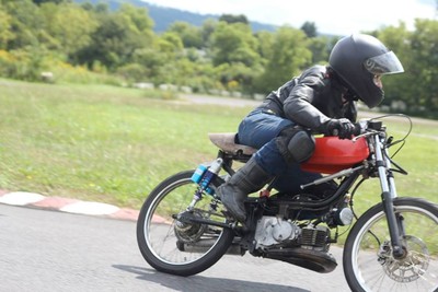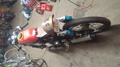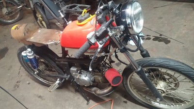 Forged in the post-apocalyptic wastelands of 1997, this bike was built for racing other mod bikes and rescuing your girlfriend from the bandit king. Still covered in track filth from racing out in the California desert at MopedGP and the New York hills at MopedGP east. Engine powered by 64cc Polini cylinder kit, Polini 4-petal reed block, aggressive case-matching, unstuffed crankshaft, balanced drive gear, Polini carburetor, and love. Frame modifications include engine swap (Puch e50 for Sachs WhoCares), ATC70 plastic gas tank, YZ80 front wheel and caliper, dirt bike foot pegs, dirt bike baffle on Proma Circuit pipe, sassy license plate, and gremlin bell.